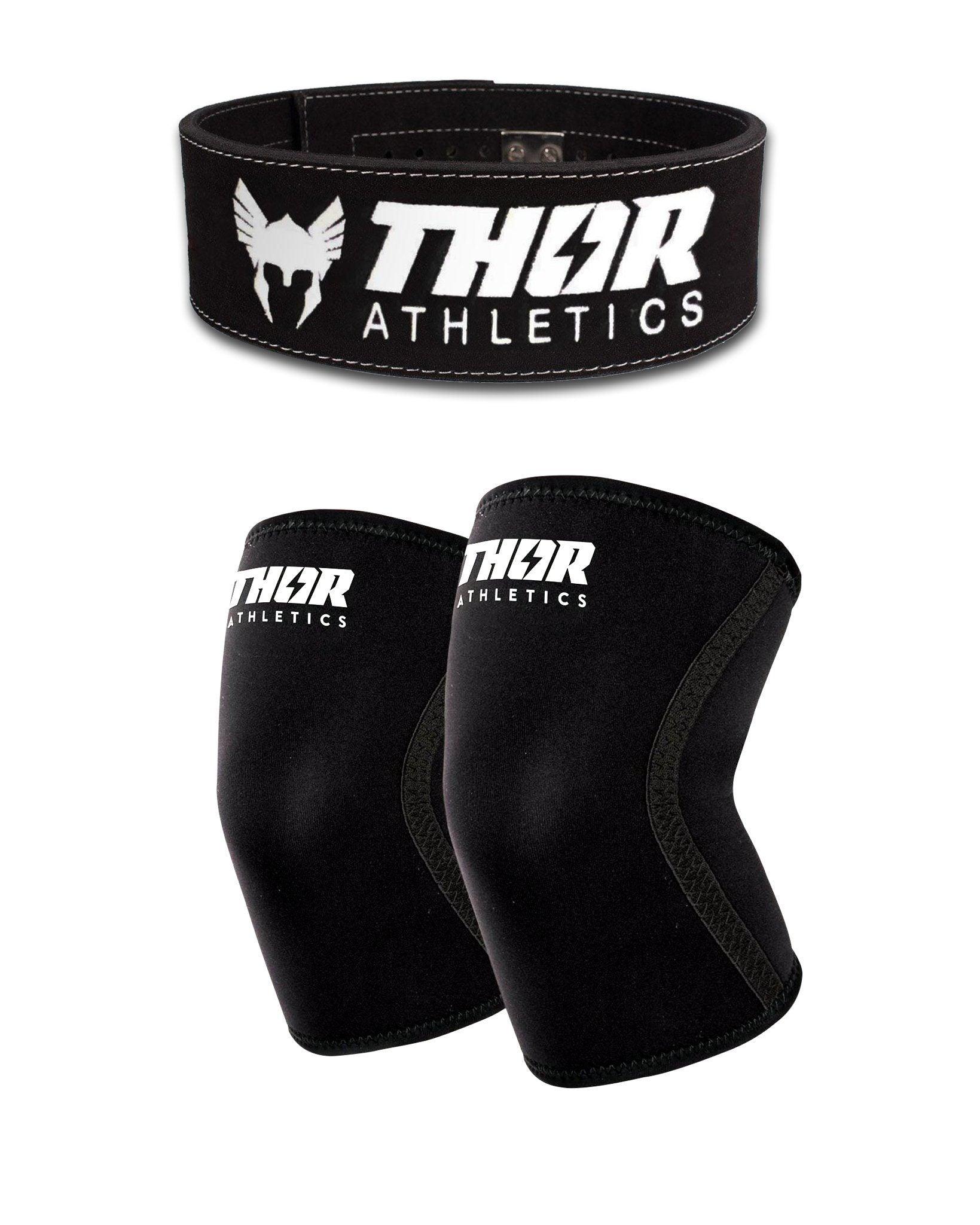 Do you want to take your training to the next level? Then our combination package of knee sleeves and lifting belt is exactly what you need!With this package, you'll get a solid foundation to improve your strength training and give your training career a flying start. Our high-quality items have been carefully selected to help you achieve guaranteed progress and get the most out of every training session. And the best part? You get it at a great price!What's included in this combination package:Lifting Belt: Our premium lifting belt offers optimal support and stability during heavy lifts. It helps strengthen your core and prevent back injuries, allowing you to train with confidence and achieve new personal records.7mm Knee Sleeve: Our knee sleeves provide compression and warmth to your knee joints, protecting and supporting them during squats and other leg exercises. This ensures more comfort and stability, resulting in better performance and less chance of injuries. With this combination package from Thor Athletics, you have the basics of what you need to take your training to the next level and achieve your goals. So what are you waiting for? Order today and give yourself the tools you need for success in the gym! The Thor Athletics products provide you with maximum progress! Extra information for the Knee Sleeves: *If you are between two sizes but you have relatively muscular calves, we recommend the larger size* *If you want to wash the Knee Sleeves, we recommend gently washing them or soaking them in lukewarm water or possibly with a little bit of soap that has few chemicals in it (like baby soap), otherwise the print may get damaged* Do you have extra questions about the size or other comments? Feel free to send us a message!