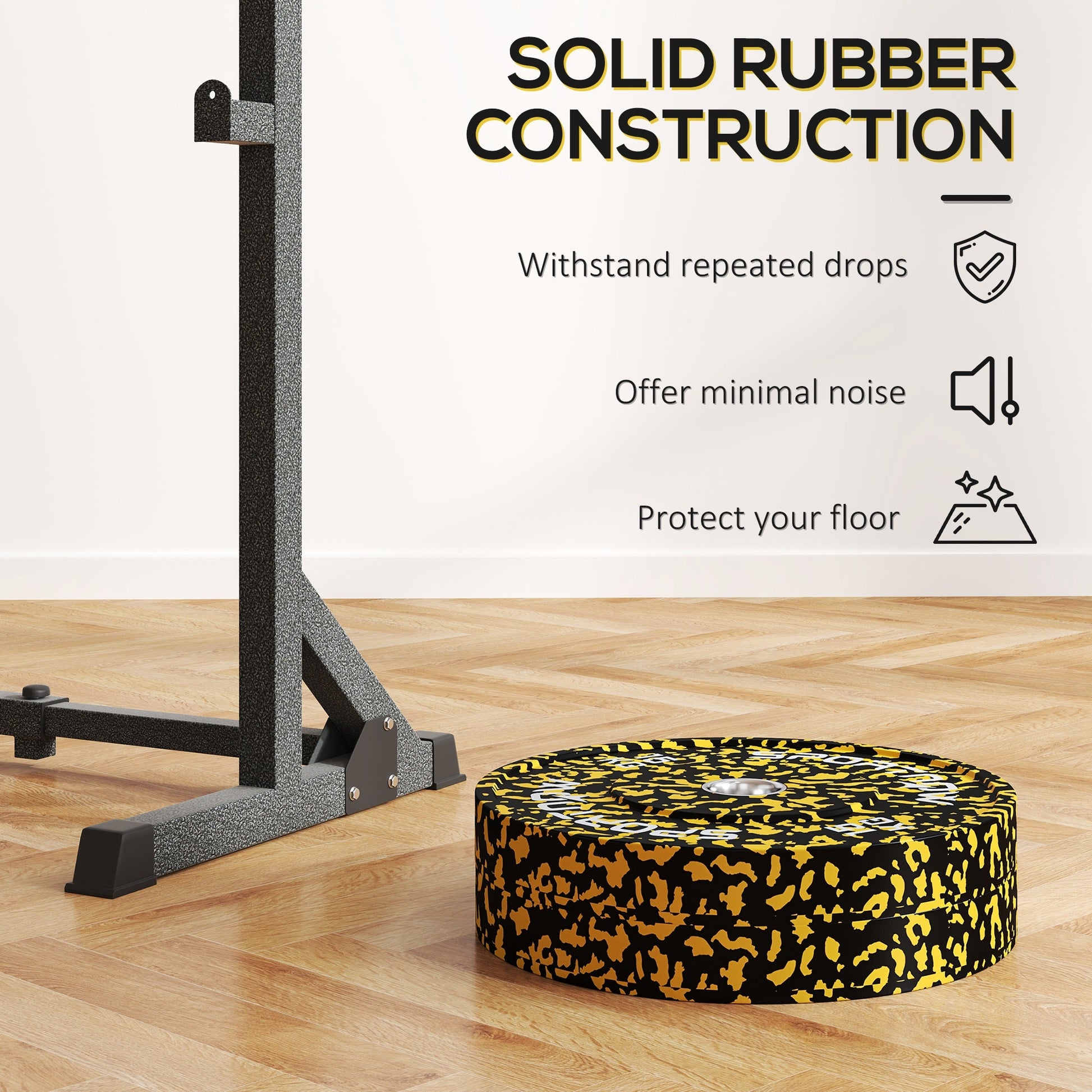 Elevate your gym sessions with the Olympic barbell weights set, crafted from solid rubber for minimal noise and maximum resilience. Each plate features a 2-inch stainless steel centre hole, ensuring a snug fit for Olympic bars. The clear weight markings allow for quick selection. Great for varied weightlifting routines from squats to bench presses!